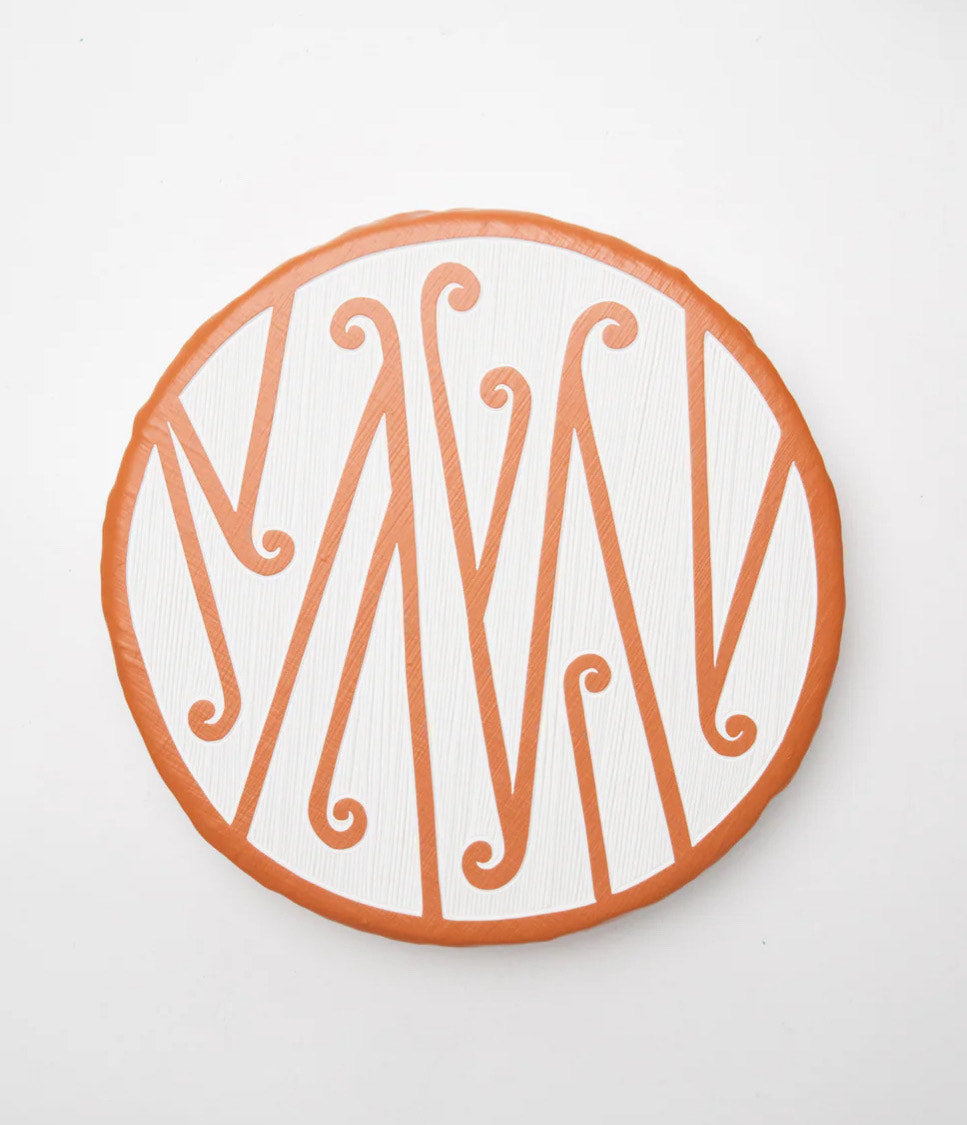 Hikurangi meticulously hand-carves into layers upon layers of paint from her Wellington studio, a technique she calls mahi whakairo peita. Often guided by her tīpuna, she uses contrasting colours to acknowledge contemporary lifestyles, whilst telling stories of the past, present, & future. The soft, yet confident curves of the koru give depth & texture, drawing you in to an art that must be touched. All of which speaks to the dichotomy of the two worlds she navigates.