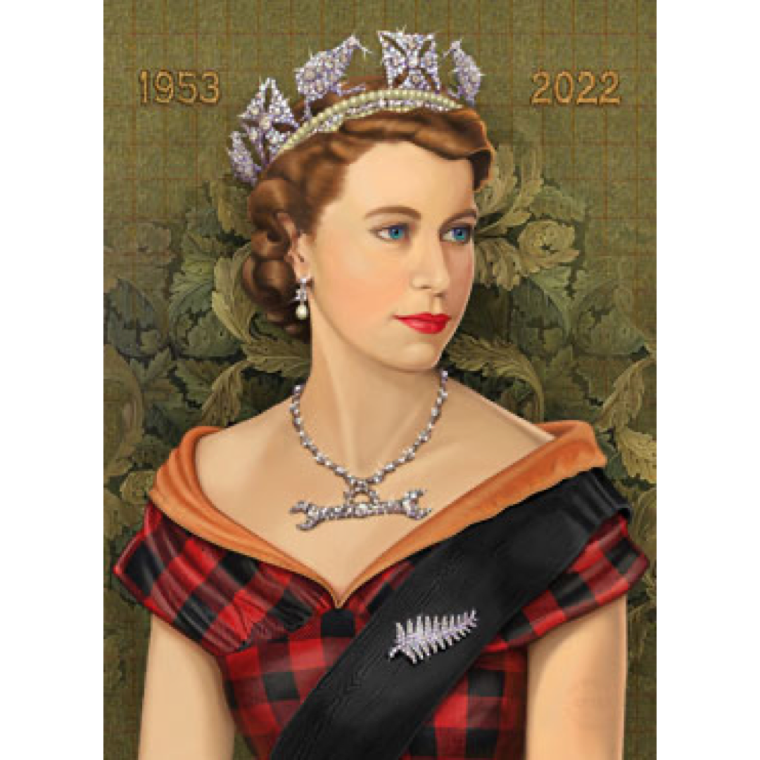 After the extraordinary coverage of Elizabeth Windsor's life there is little to say other than she was a paragon of service and the even hand. This artwork celebrates who she was during her years as New Zealand's queen, her down to Earth nature, her time as a mechanic in the Great War and her love of the rural and the outdoor lifestyle. Horses, dogs and long walks in the hills were her loves, the Crown was her duty. Well done Liz.