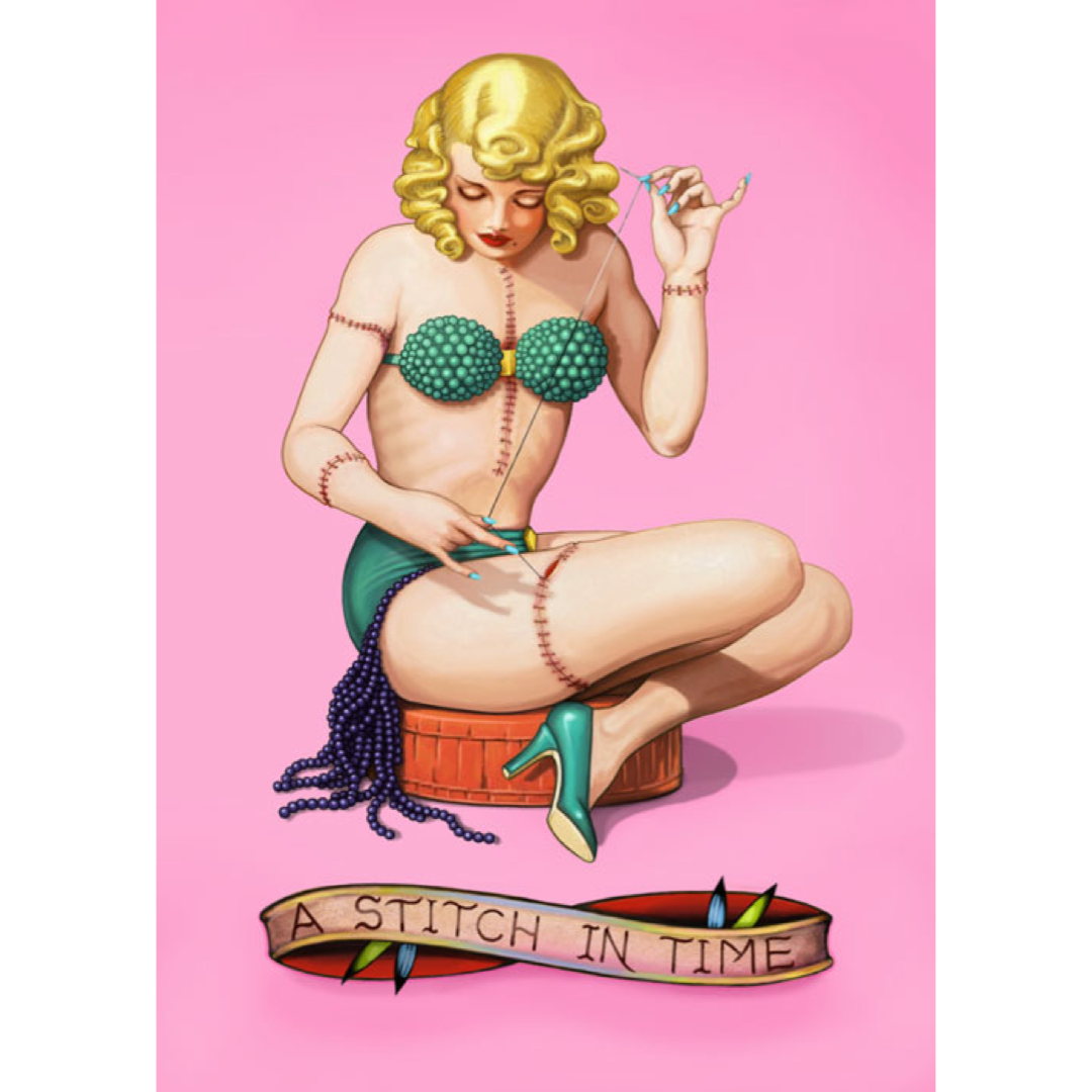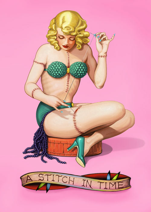 Ever think we just have to sew ourselves back into the best versions of ourselves we can and then carry on? I have based this image on a thirties pin up and expanded her into the dark idea that has been around for decades of stitching the self. We all search for the heart to face the slings and arrows of outrageous fortune with that attitude of just leaning into what seems to try to break us down.