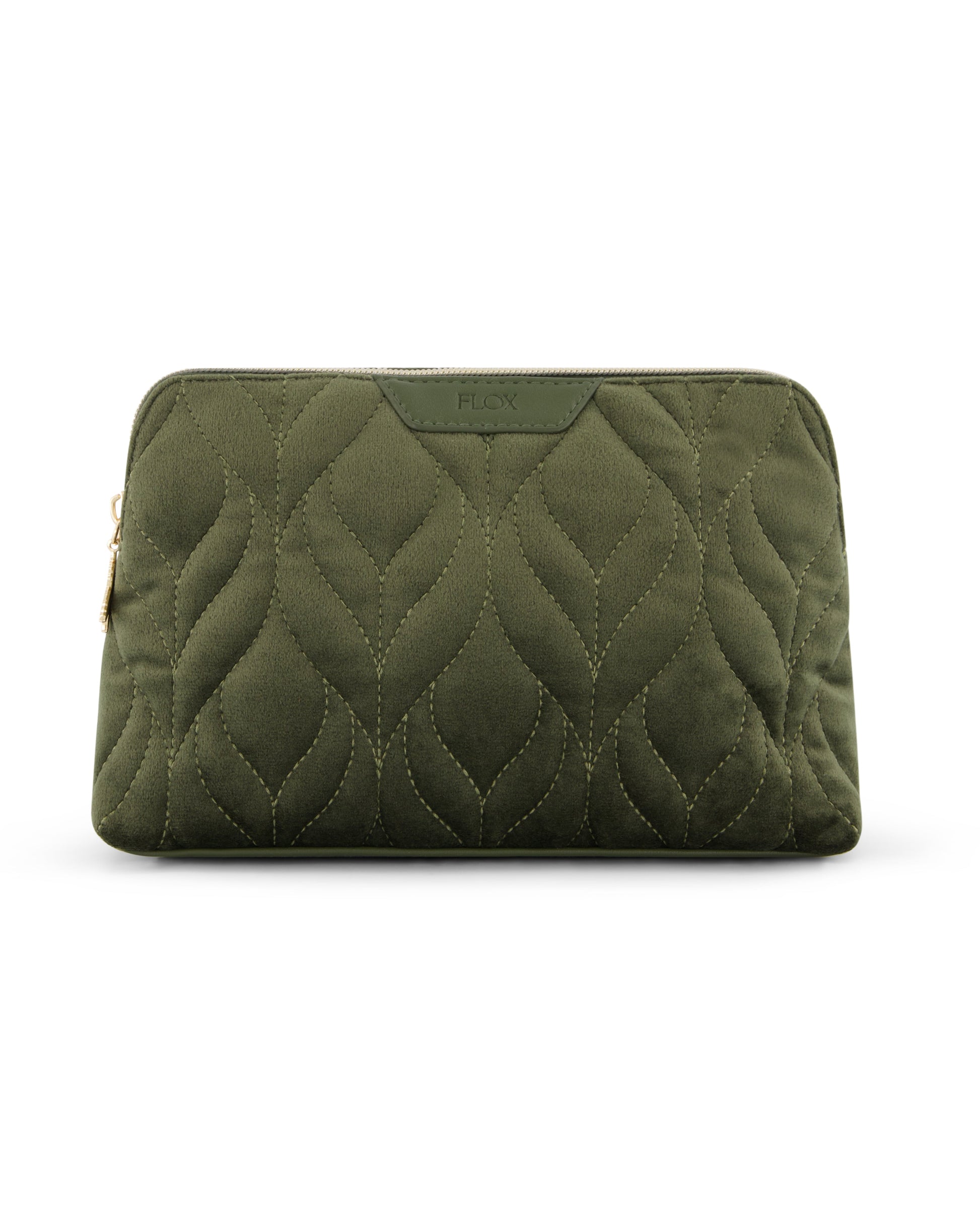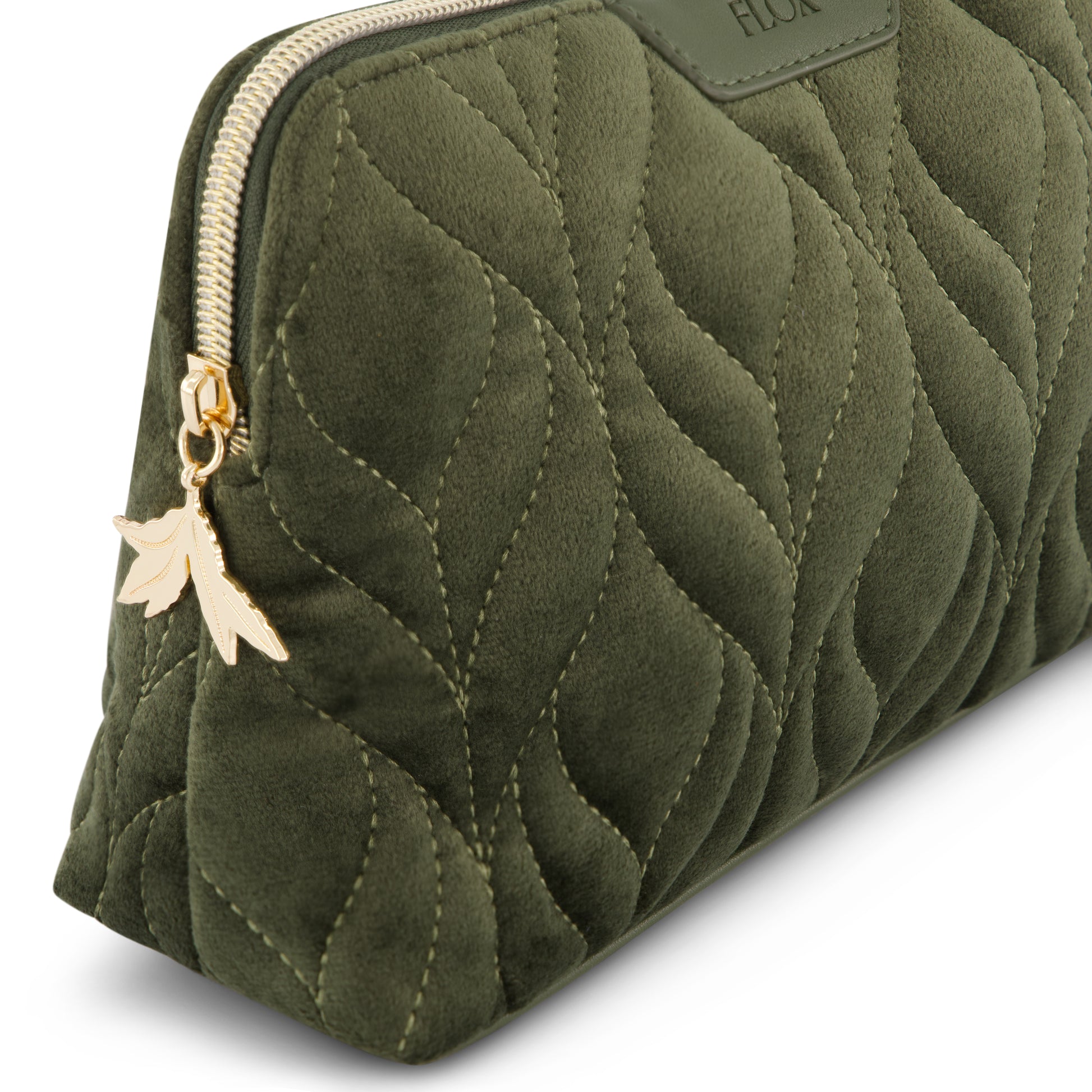 A statement in both luxury and function, these Ahi cosmetic bags offer refined elegance with a practical edge. Featuring satin lining of a FLOX earthy print, a custom pull zip with two internal pockets. Made out of quilted velvet material.