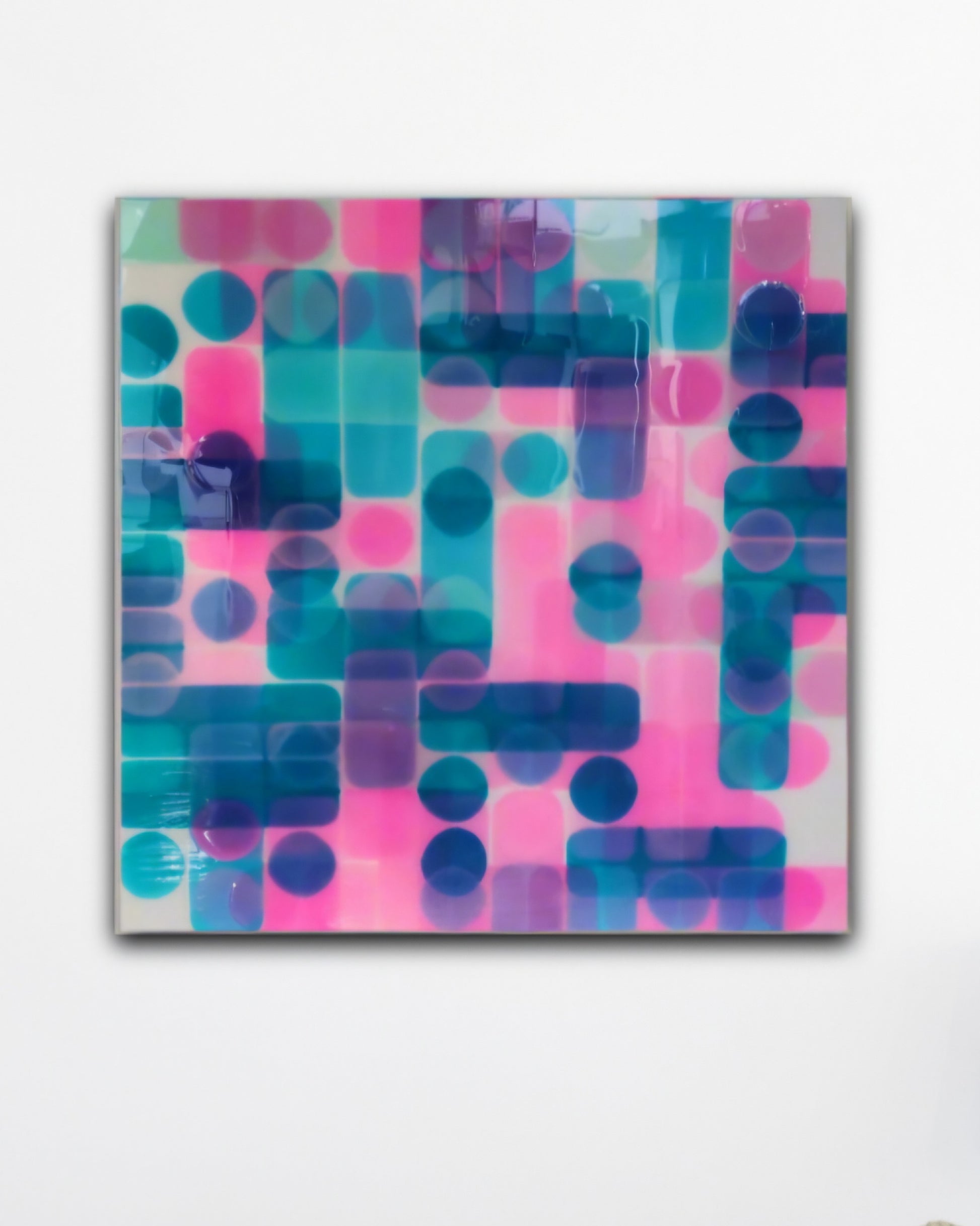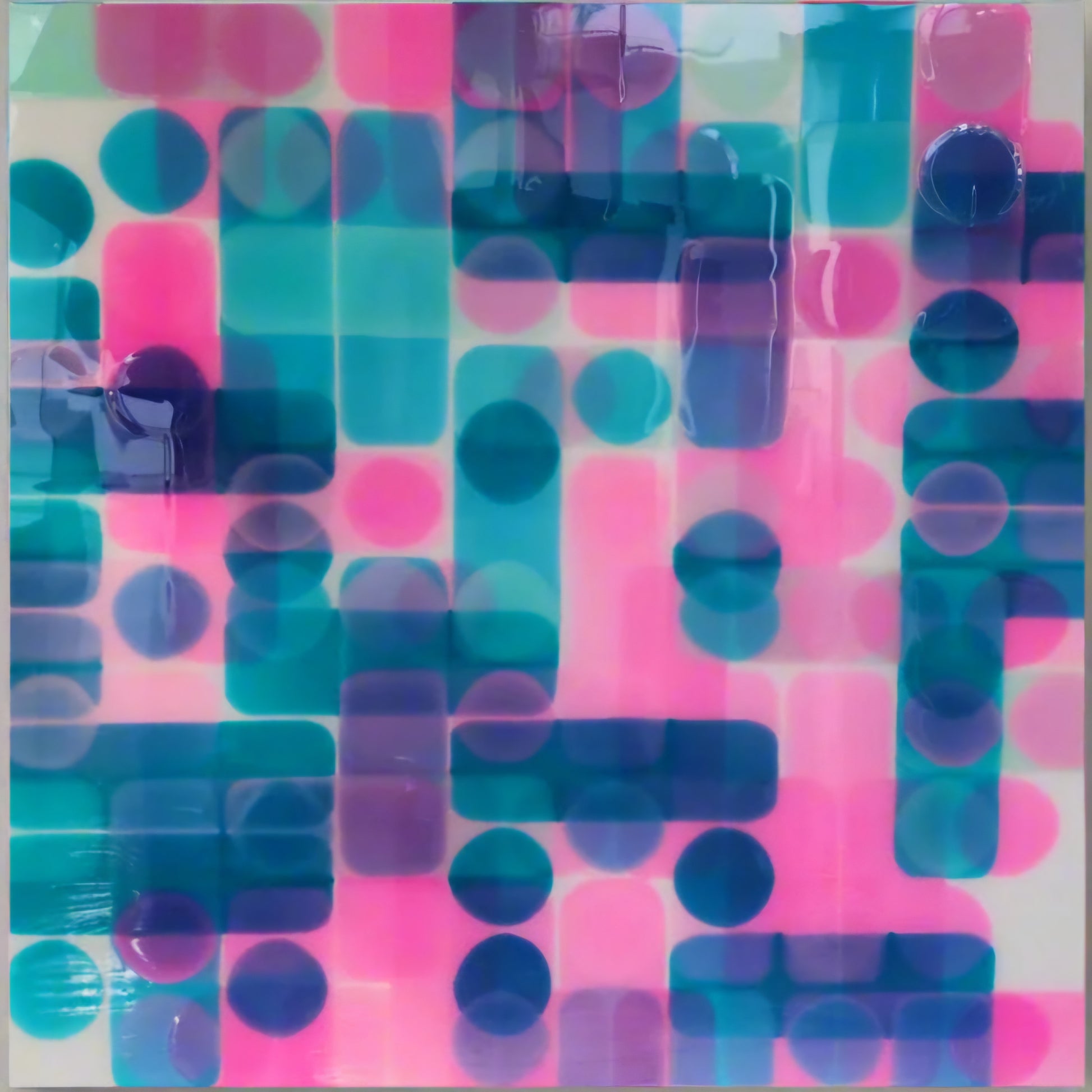 Literally translation flipped onto an artistic base. The title of each piece is translated into Morse Code, and then painted on a grid. Rotation of the board and introduction of colour elevate the secret translation.