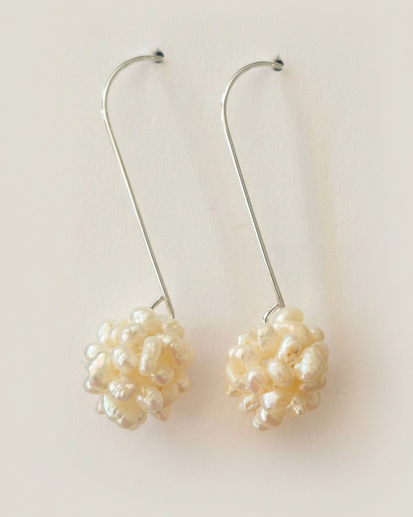 The Cluster Pearl Long Drop Earrings are a sleek and playful look. The minimal design of the sterling silver is complimented by the organic pop of grouped pearls.