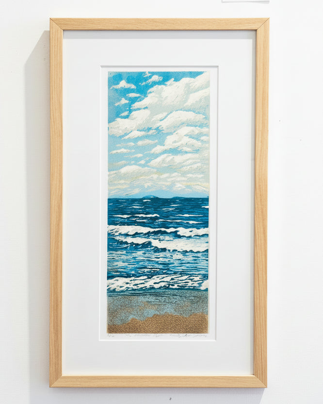 To capture such a scene, she explores the unpredictable and imperfect processes of printmaking. Often combining different traditional techniques, such as monoprinting to capture subtle colours and light; collagraphs to add texture and depth. Woodblock printing gives her work definition by focussing on the linear patterns and contours within the landscape.