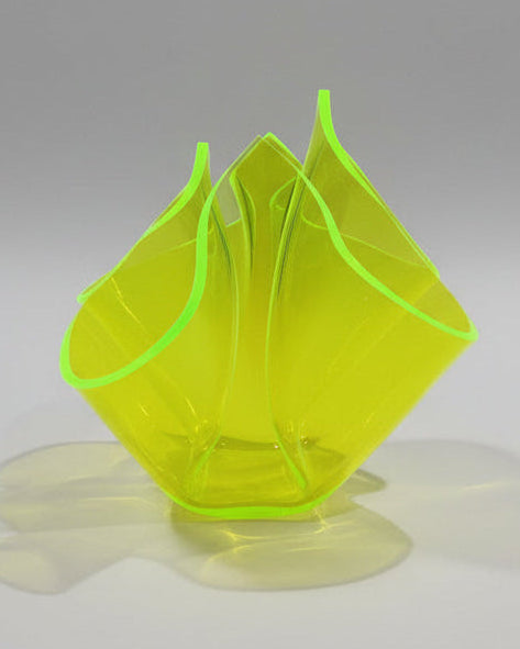 This series of blooming polymethyl methacrylate sculptures explores notions of formal uniformity, spatial density, and compositional equilibrium. Emerging from an initially planar condition, each piece is transformed through a self-taught methodology of volumetric origami. Logan employs dual flamethrowers as performative tools to activate and manipulate the thermo-reactive surface, orchestrating a play between heat and form. Each bloom is a singular, hand-crafted artefact that pushes the inherent material limits of cast acrylic — negotiating thickness tolerances, structural solidity, and thermal thresholds.