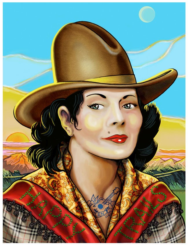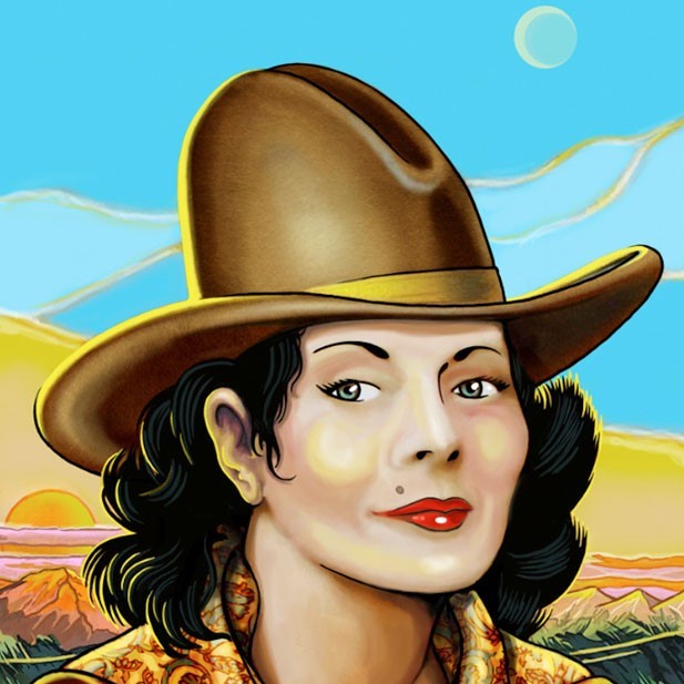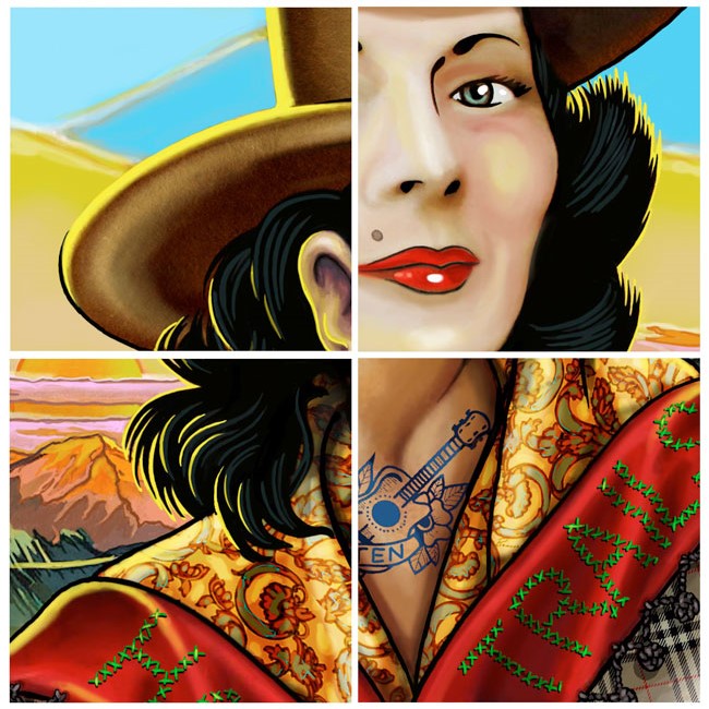 A few years ago I spontaneously started signing myself off with “Happy Trails”… As a lad the term “called” as I imagined long weeks riding through big country under big skies. I rode horses often and loved the hills out of town and herding the wild cattle there. I’ve always loved the old cowboy comic artworks and created this Sunset Cowgirl to celebrate moving into a new day and wishing everyone good things on their journeys. The sun and the moon, big hats, shawls, cross stitch, camp fires, and a tattoo remembering those great country tunes like that played every week on The Sunday Program when I was a kid. Maybe it’s a Boomer thing but happy trails to you all.