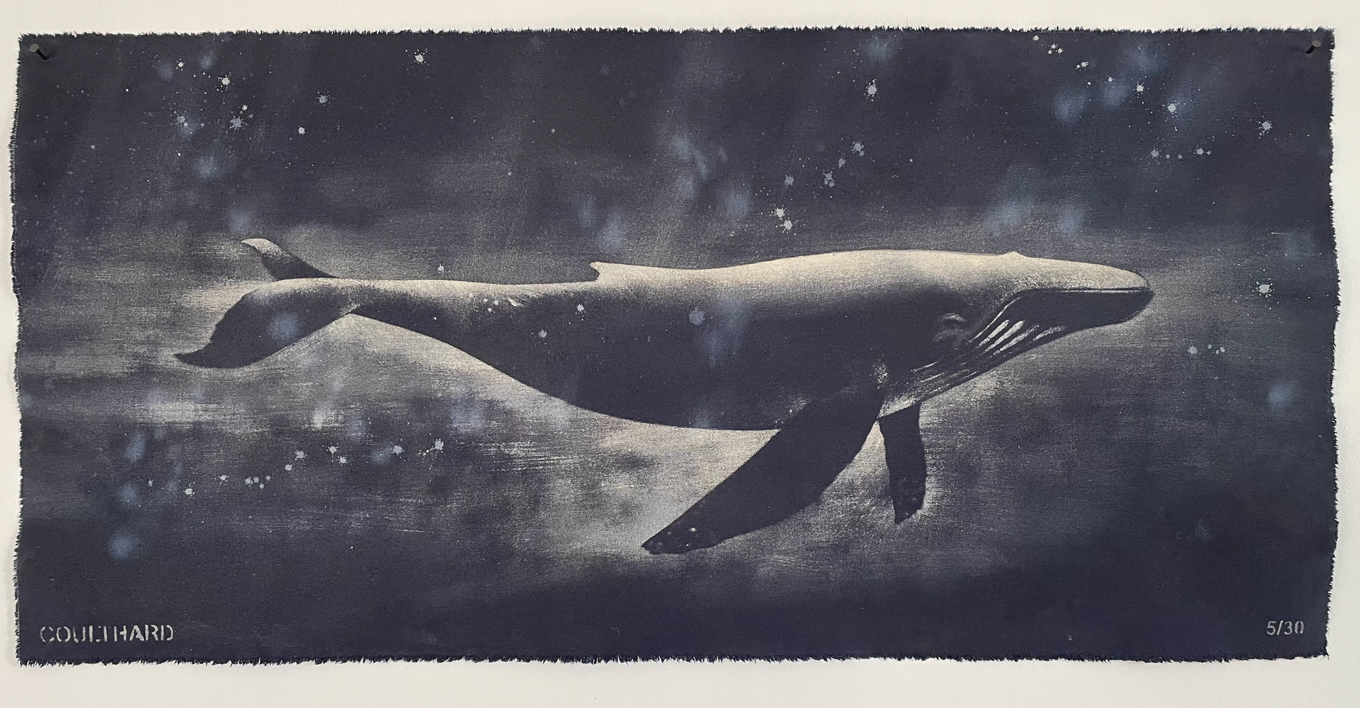 Humpback Whale Painting on Canvas Hand-painted acrylic artwork on dark green cotton canvas, each piece uniquely created using stencil techniques combined with gravel texturing and wet splatter effects. No two paintings are identical, ensuring an original addition to your collection. Both sides are varnished for lasting protection and durability.
