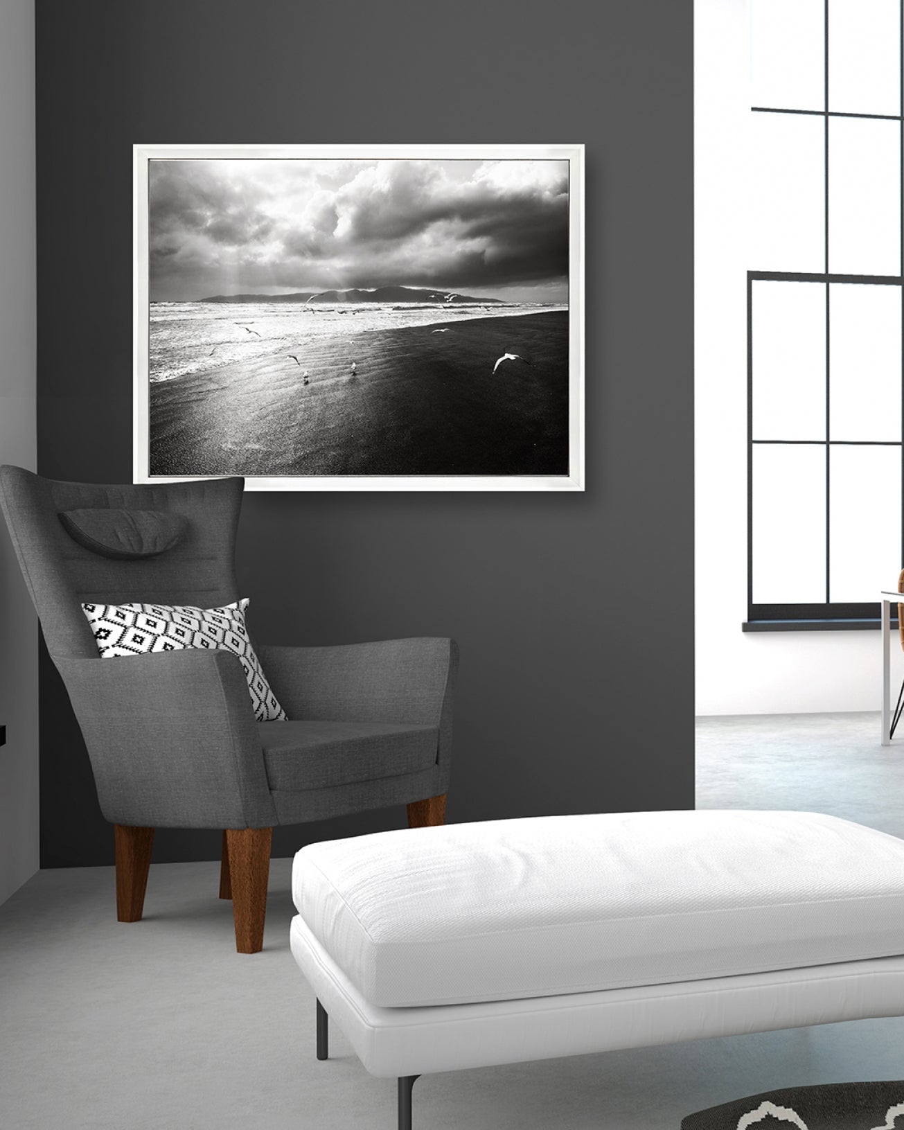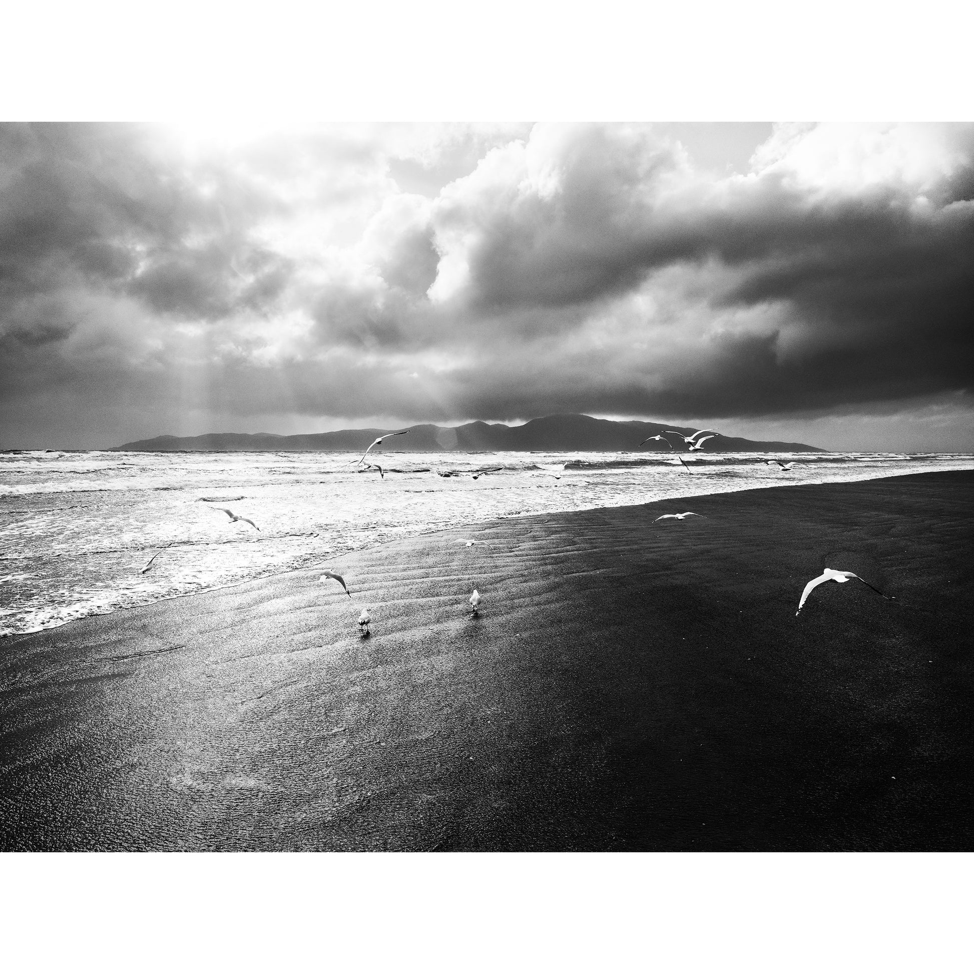 "Having driven this section of the coast for many many years, I had been seeking a strong image of Kaipti island, something compelling, something I hadn't seen before. And on this afternoon, the wind was fair howling. Perfect! Spotting a group of gulls on the beach, I inched closer until they took flight - a process I repeated a dozen times until I felt I had the right combination of gulls & light. And I think this nails it!"