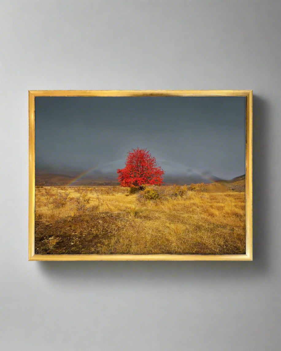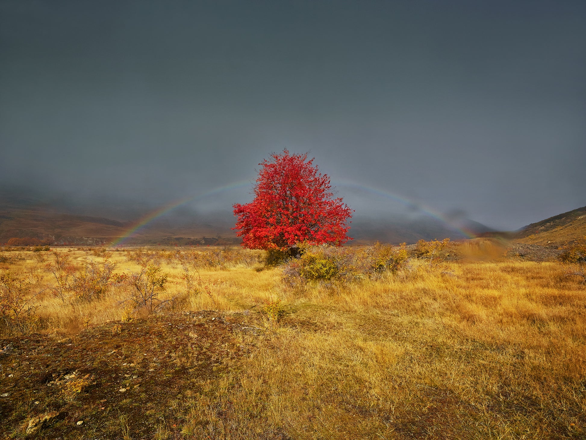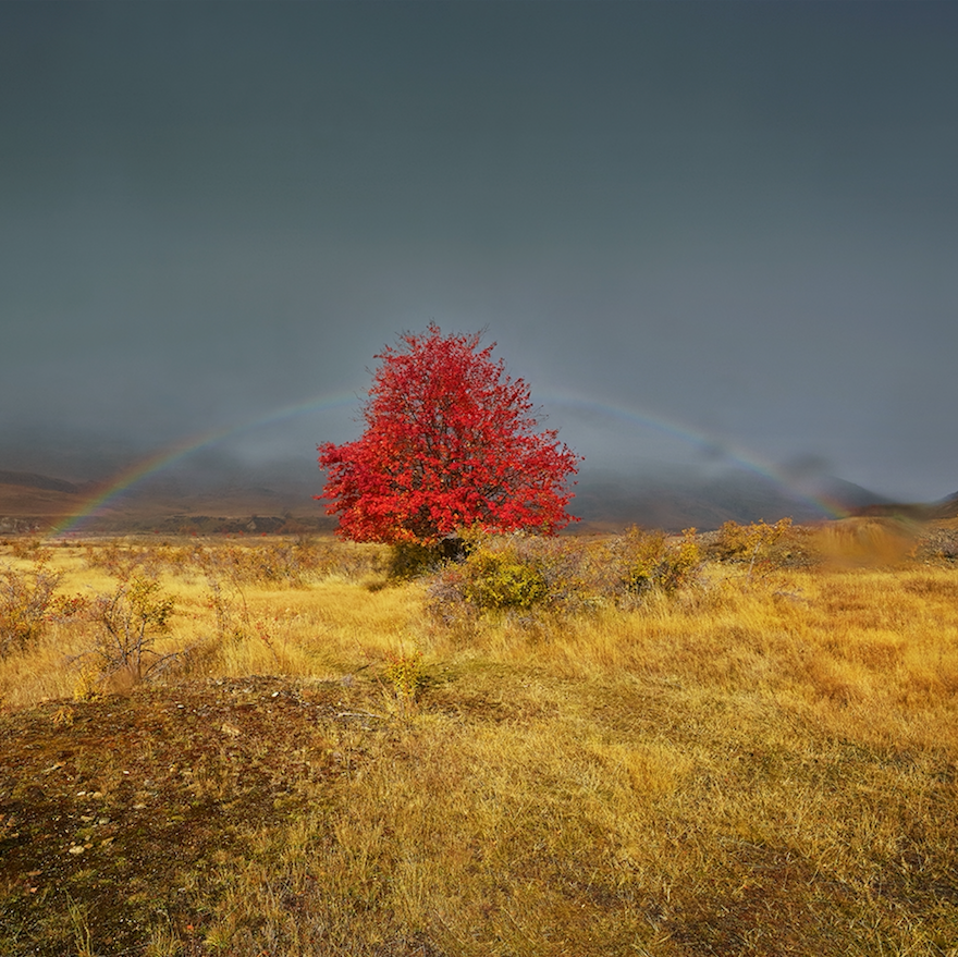 I only decided to take this road in the last second & it turned into the most remarkable day of all, the season’s first snow had fallen the day before & the weather was in constant flux. After capturing the fallen leaves under this tree, something made me look back over my shoulder & I could hardly believe what I was looking at ...OMG, QUICK! Fighting driving rain, I struggled to keep my lens clear long enough to capture the magic before the light dulled & this rainbow faded. Two frames were all I got, but I reckoned I'd hit the jackpot!