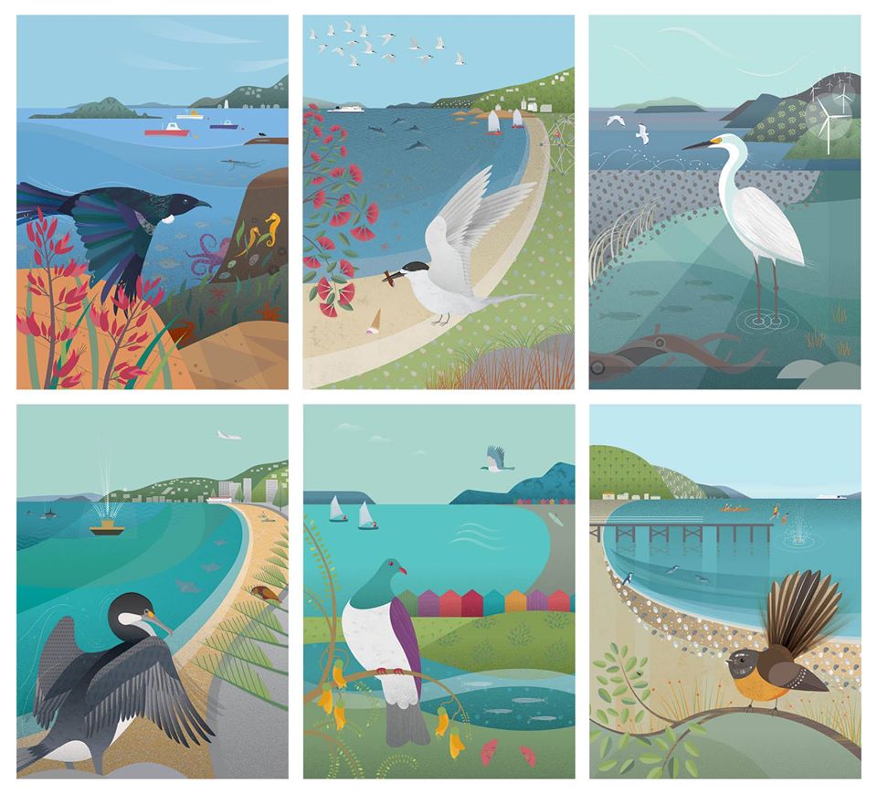 Jo Priest is a designer and illustrator that loves living on the coast of Wellington. She has a background in TV and film editing, but after taking a break to raise her four children, retrained as a graphic designer. Jo graduated from Whitireia Polytechic in 2018 with a degree in design. Her series of illustrations of the Wellington coast began as her graduating project. Jo is inspired by the beauty and diversity of the Wellington coastline and is drawn to depict the native birds and plants that live there. Her illustrations show the locations through a conservation lens where the birds and marine life are the focus.