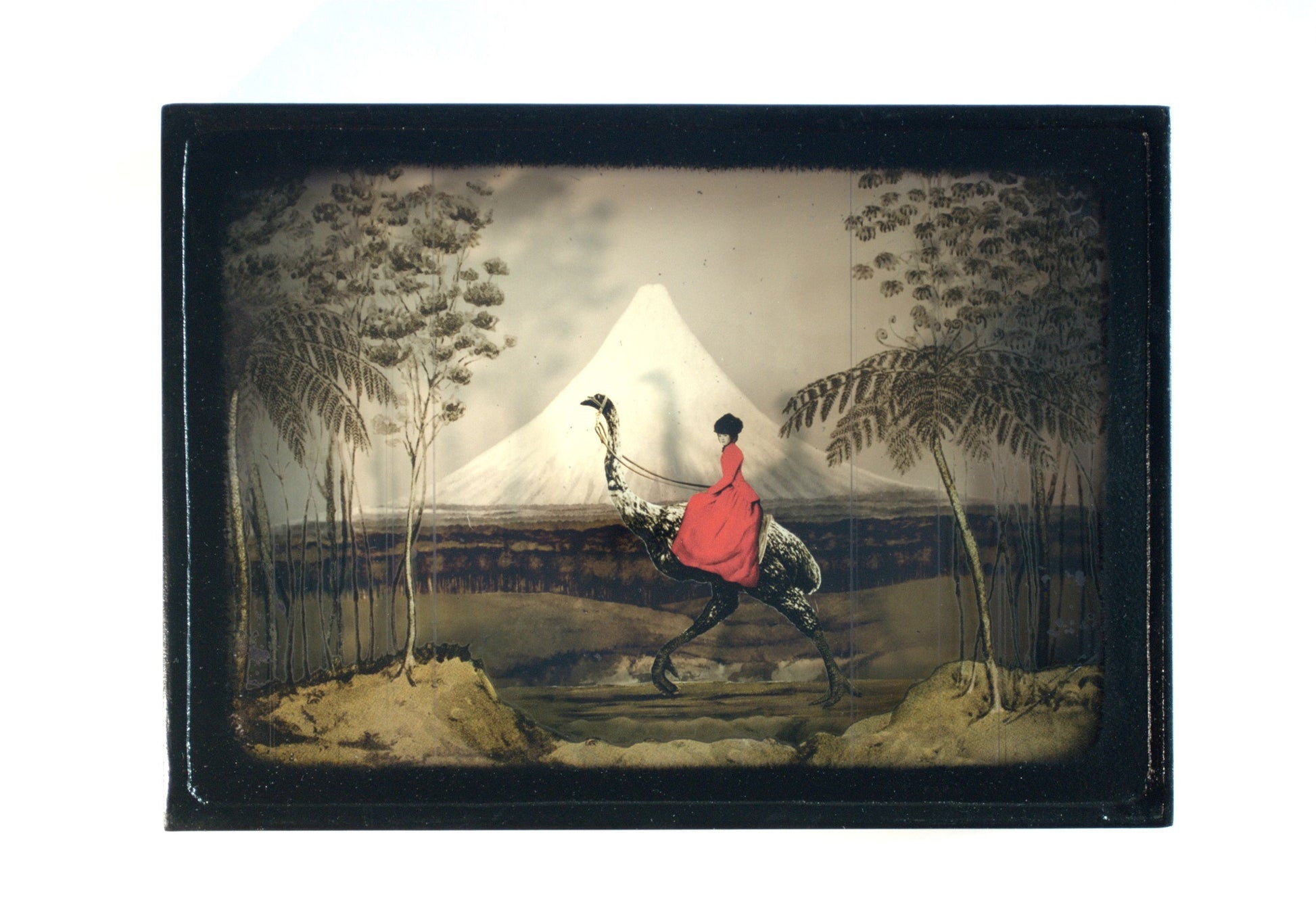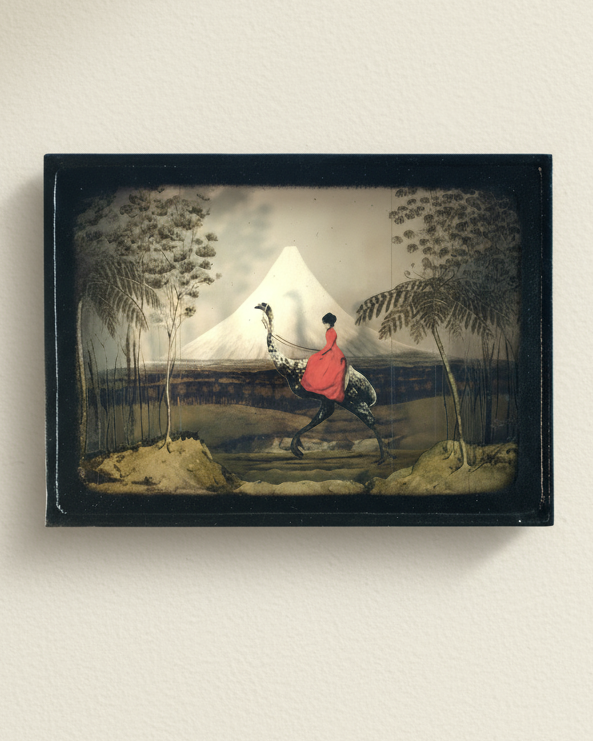 Moa Diorama - Taranaki is a digital collage printed on glass & acrylic panels, mounted in wooden frame