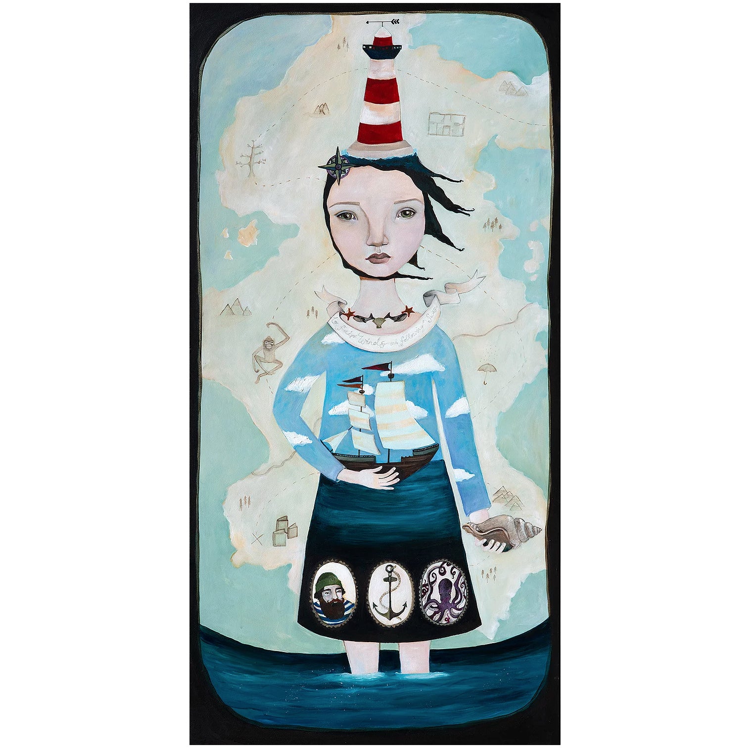 This painting is a comment on the rough seas of life, being a lighthouse for the people you love and the storm that you can sometimes find yourself at the center of whilst always trying to remain strong and calm. The island behind the tower of stability depicts the cornerstones of family life - the books represent education, the umbrella represents shelter, and the floor plan represents that physical place you call home and of course the inevitable chaos that sometimes ensues is represented by the monkey
