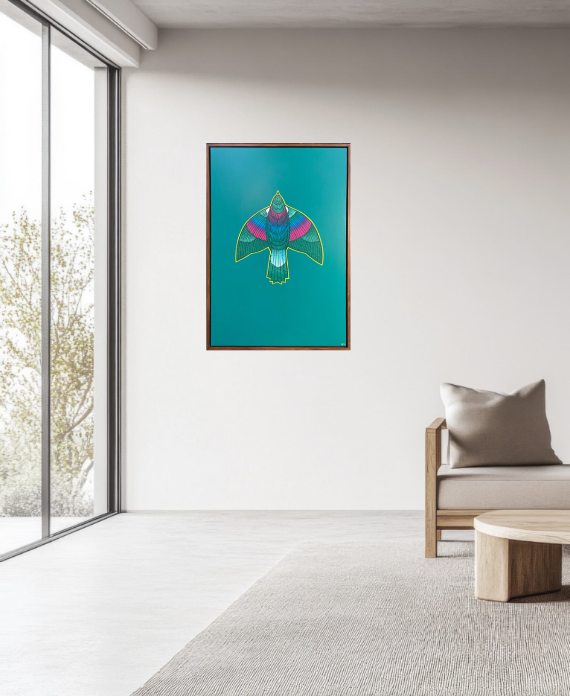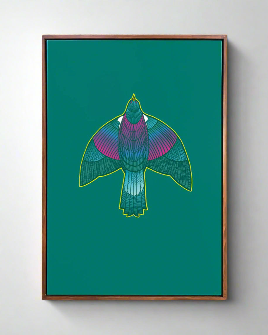 The artwork re-imagines New Zealand before human settlement, featuring hand-drawn animations of native bird species such as the Tuī, Kereru, and Pīwakawaka. These birds are depicted harmoniously flying over a generic stream, symbolizing any of Aotearoa's many waterways. The Guardian Eagle ‘Owaaku’ oversees the birds and land, leading them across the sky. Meanwhile, the local Taniwha of the river warns of its dangerous beauty as fish gracefully swim in their habitat, reminding us of the knowledge that flows from mountains to the sea.