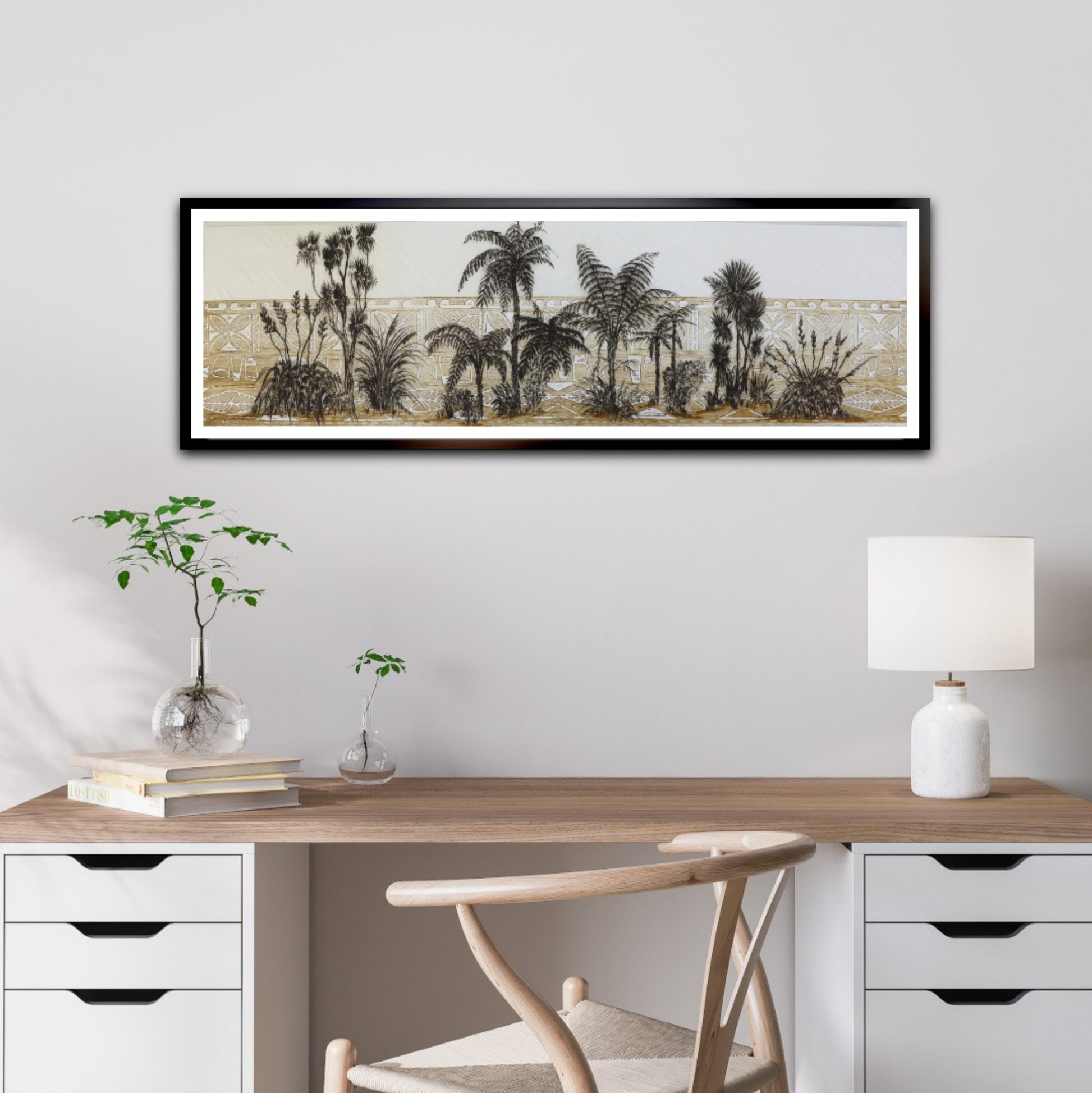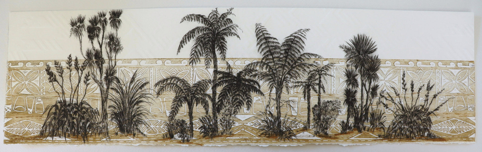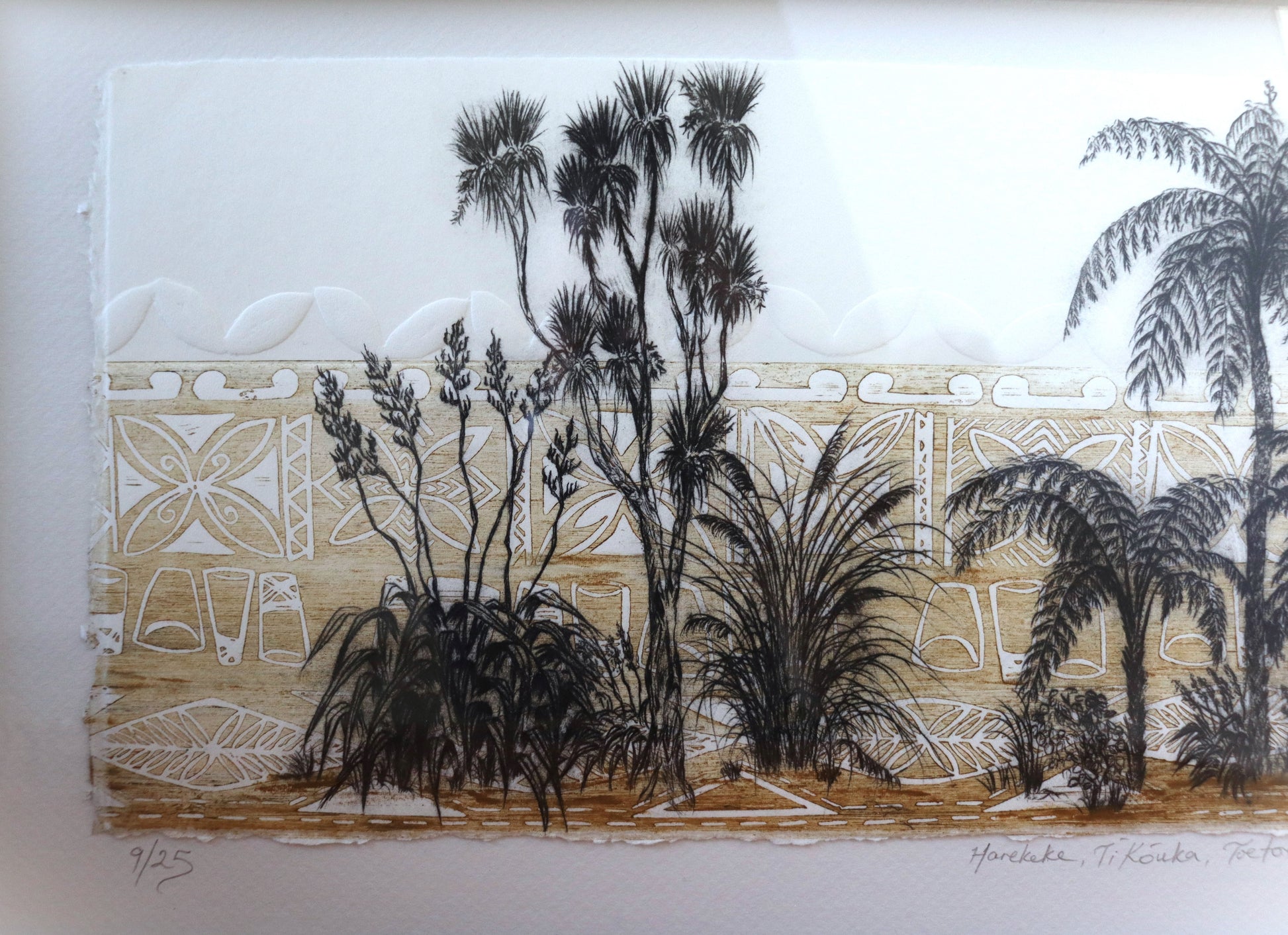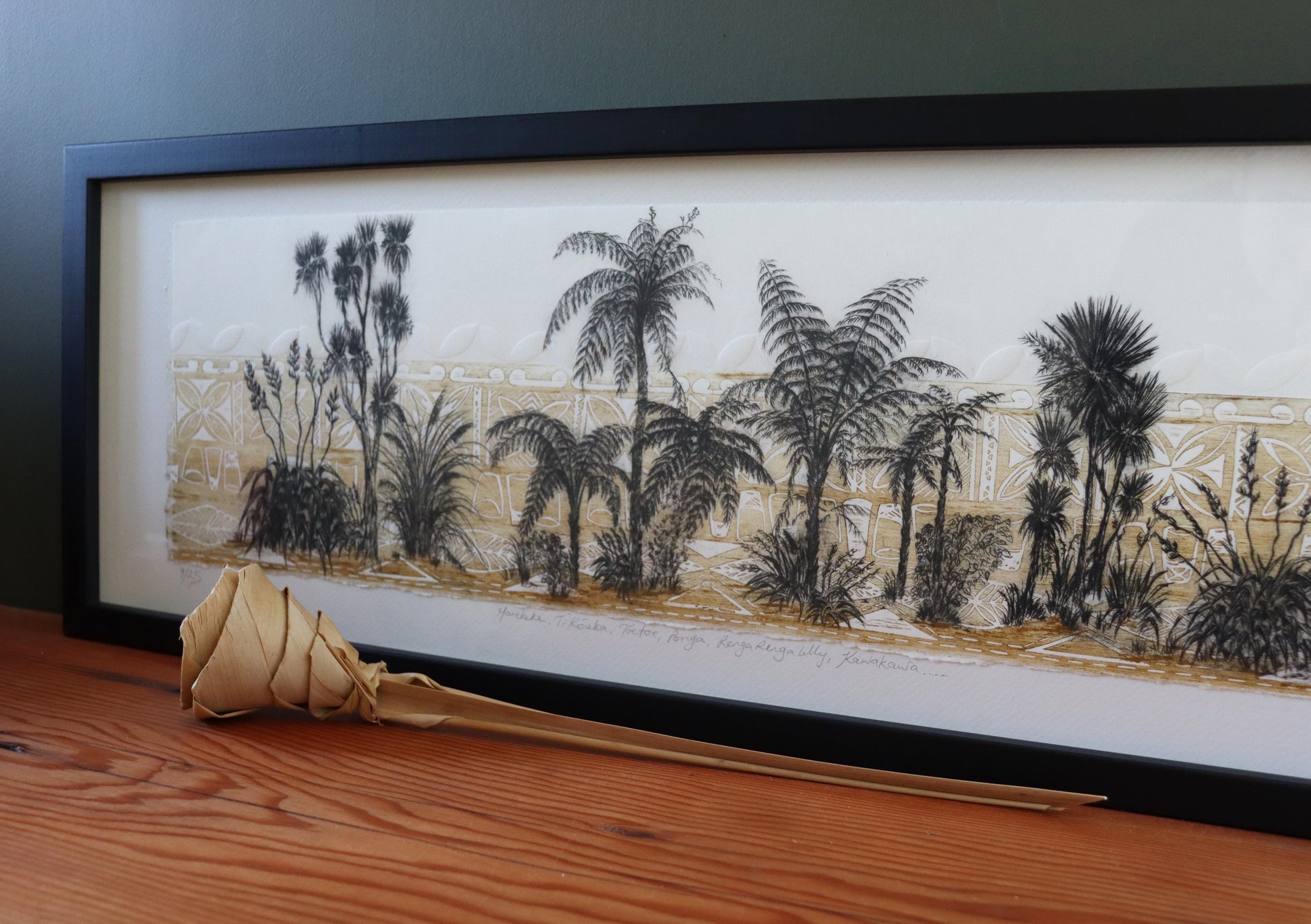 Featuring New Zealand native bush: Harekeke, Ti Kouka, Toe Toe, Ponga, Renga Renga lilly and Kawakawa