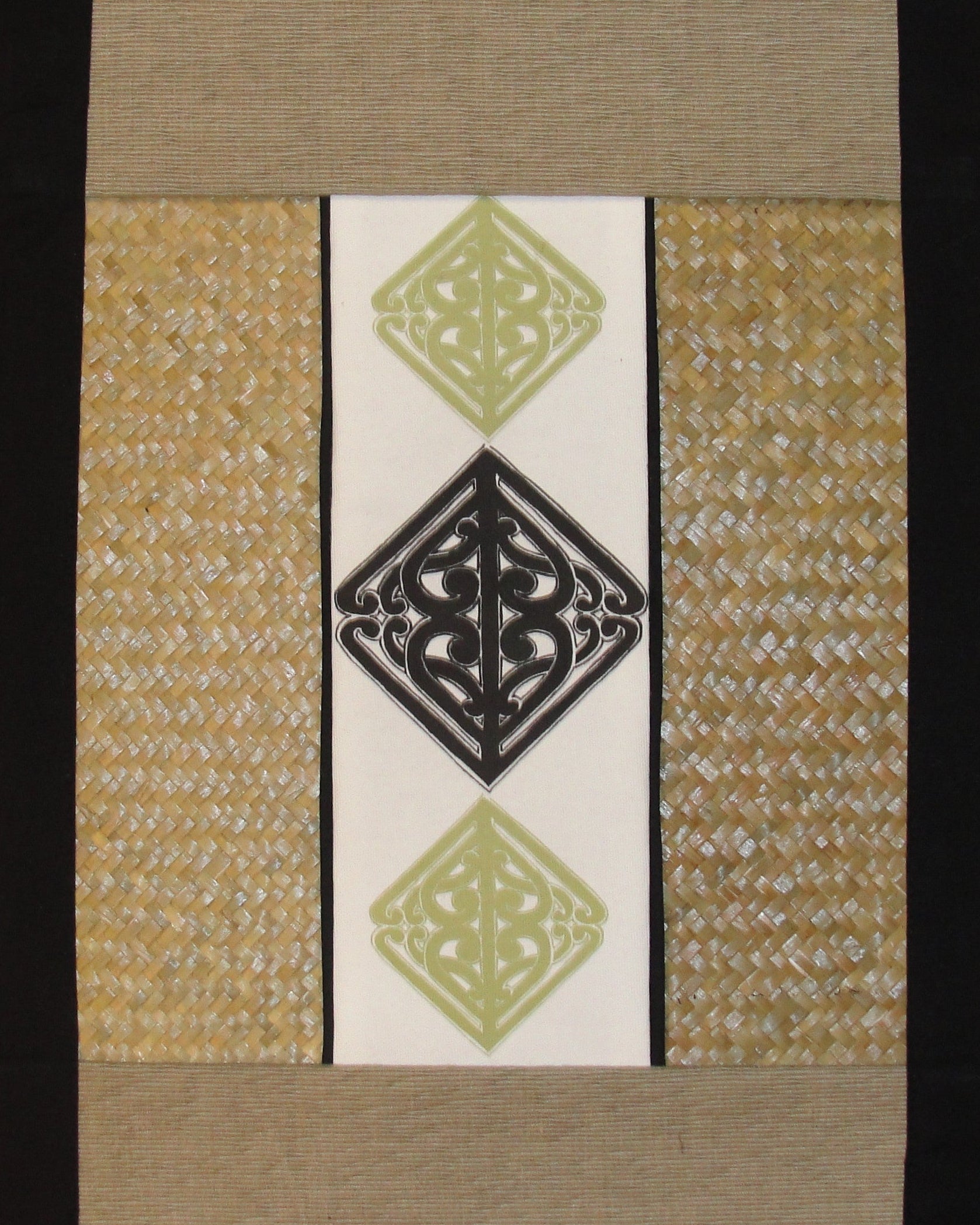 Pā o te hā means 'meeting of the life essence'. The pattern was inspired by a combination of kowhaiwhai (Māori painted ornamentation) Norse and Celtic knotwork designs and represents the coalescence of my Māori and Pākehā ancestry.