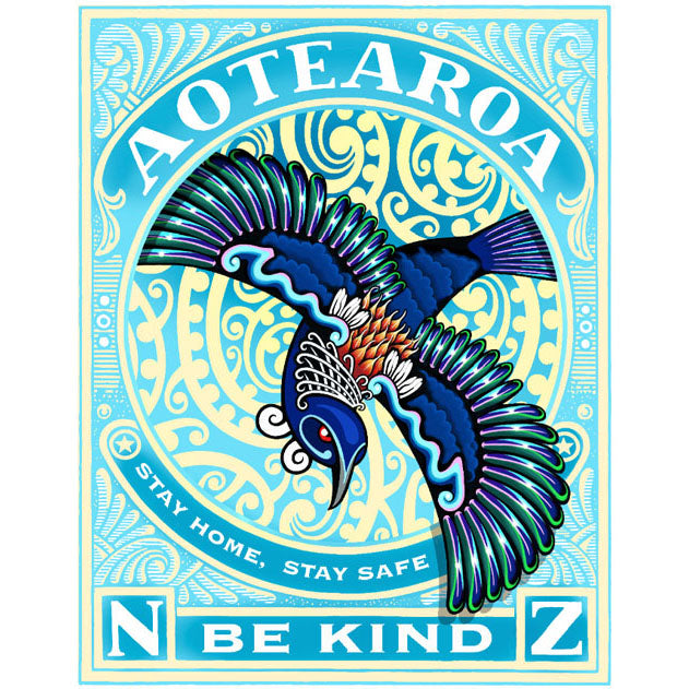 At the beginning of lockdown I thought WTF!! life as I know it as an artist is finished.. for about a day. Because at times like these artists can turn up and be a part of the effort or fold.. I decided to lean in and in partnership with Phantom Bill Stickers I created this work for the streets of Aotearoa NZ. I was in the right place at the right time with the right contact and still had my studio operating at my home while in my bubble of one. I believe in the effort to minimise infection and relate to the tough measures we must follow to succeed. The artwork was created to offer optimism and energy to our efforts together. STAY HOME & STAY SAFE.