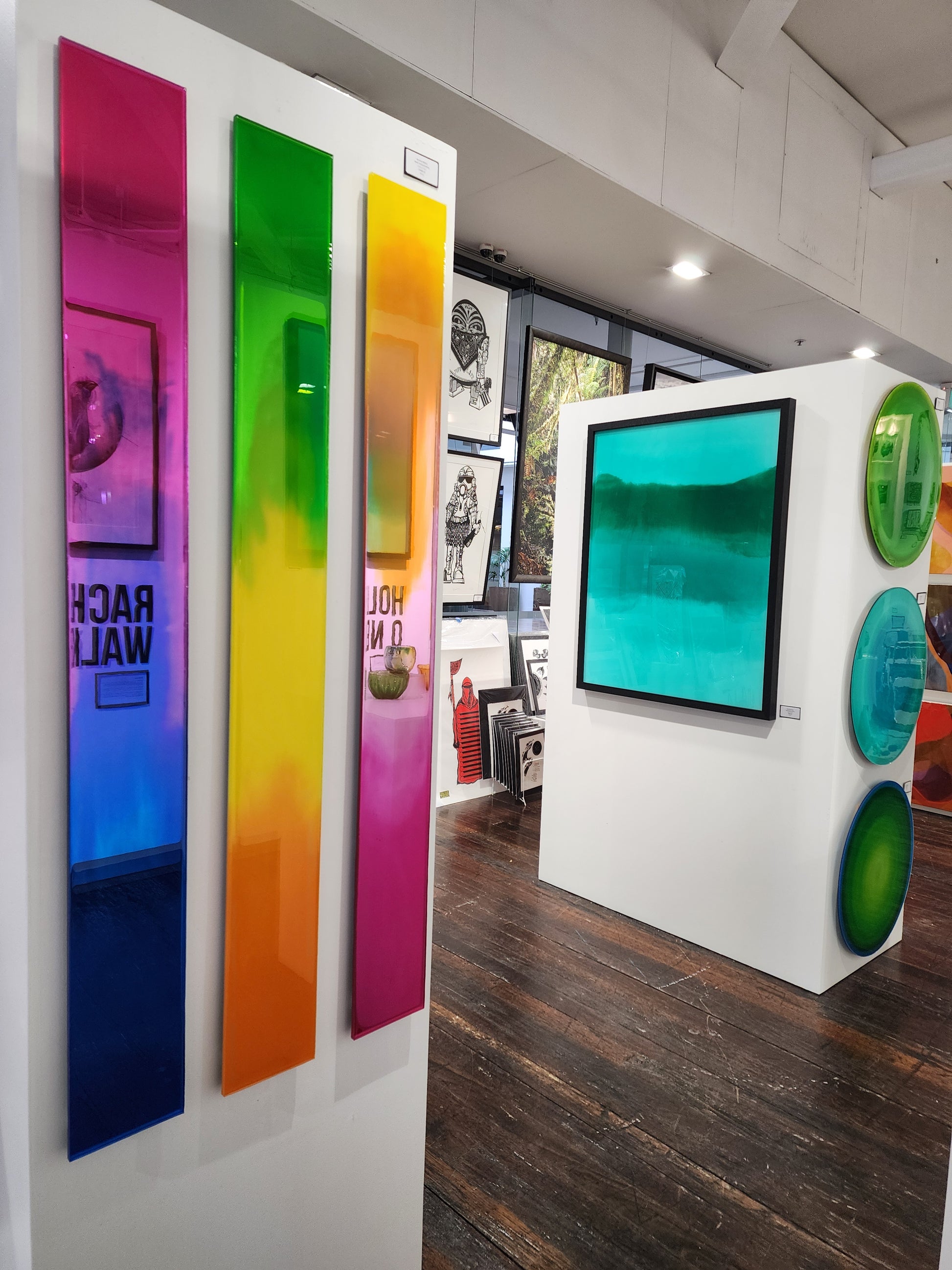 Hollie O’Neill invites viewers to immerse in the ethereal interplay of light, colour, and abstraction. Her work explores emotions through fluid compositions of pigments and resin, focusing on the emotive power of colour and form. Each piece balances simplicity and complexity, revealing subtle gradients and textures. Highlighting the contrast between material manipulation and spontaneity. Based in Auckland, O’Neill works in abstract minimalism and stylised realism.