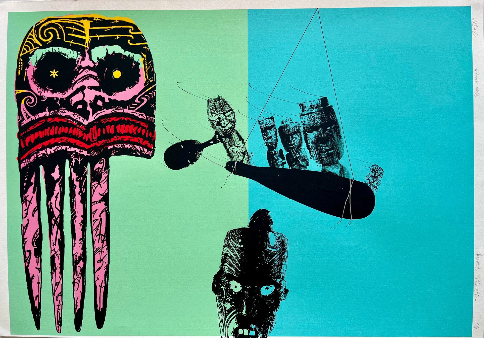 My journey has involved a fusion of influences, stories, bold colour and tohu (sign). These include Māori creation myths, tā Moko, tāonga held in the British Museum, popular culture, art history, ‘DJ-ing’ and personal narrative. My screen prints are not about a single issue, but rather cover many issues that are interconnected. I am attracted to beauty in whatever shape or form it may present itself to me and hold things that are precious or have cultural significance paramount in my work.