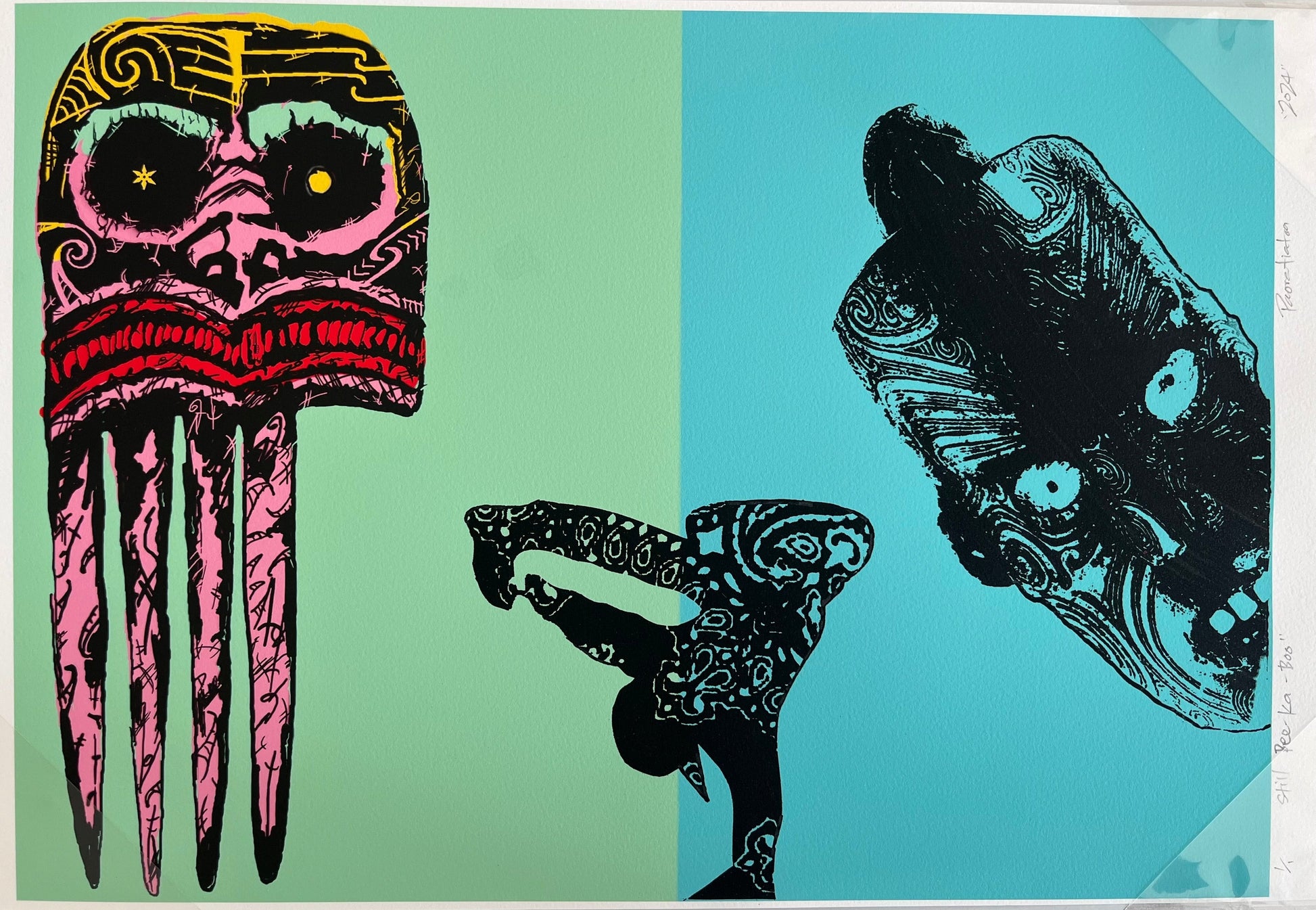My journey has involved a fusion of influences, stories, bold colour and tohu (sign). These include Māori creation myths, tā Moko, tāonga held in the British Museum, popular culture, art history, ‘DJ-ing’ and personal narrative. My screen prints are not about a single issue, but rather cover many issues that are interconnected. I am attracted to beauty in whatever shape or form it may present itself to me and hold things that are precious or have cultural significance paramount in my work.