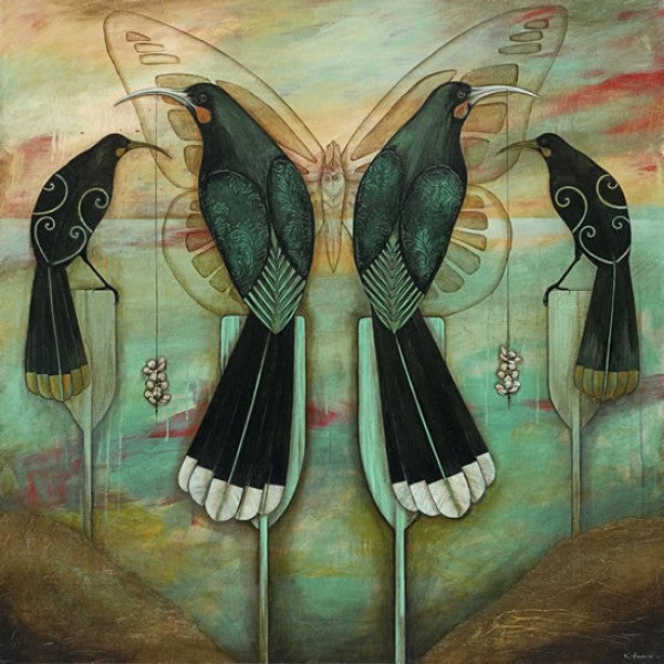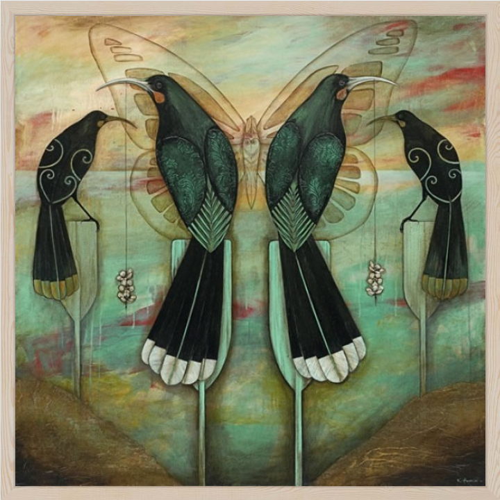 Amplifying the compassion and warmth of these heart-filled creatures, who live in the moment, I verge into portraiture. Placing Tui and Piwakawaka upon pedestals, I admire their wisdom and integrity through stories and legends which have been told. I introduce objects of sentimental value to reflect their importance in an attempt to bring awareness of their fragile existence, an ongoing essence throughout my work.