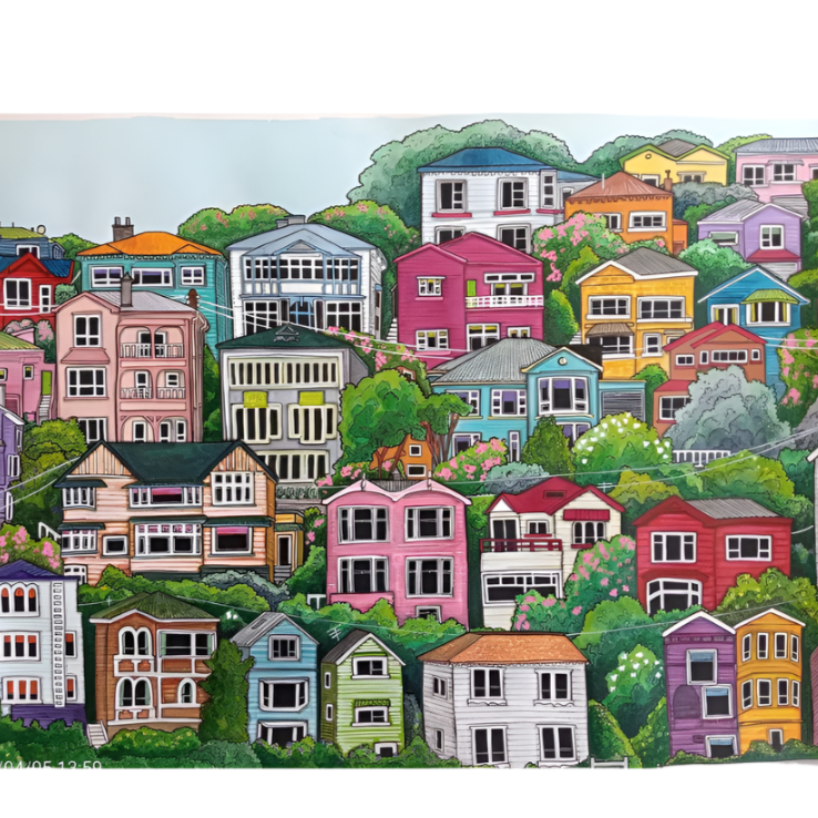 ‘‘Wellington Houses’ is a colourful unique impression of the beautiful houses dotted around the Hills of Wellington. It could in fact be any place in New Zealand. The houses have been taken from different parts of Wellington and combined to create the unique ‘stacked’ look that is echoed around the hills of Wellington.