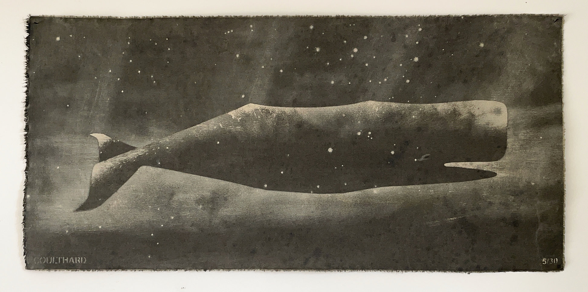 Sperm Whale Painting on Canvas Hand-painted acrylic artwork on dark green cotton canvas, each piece uniquely created using stencil techniques combined with gravel texturing and wet splatter effects. No two paintings are identical, ensuring an original addition to your collection. Both sides are varnished for lasting protection and durability.